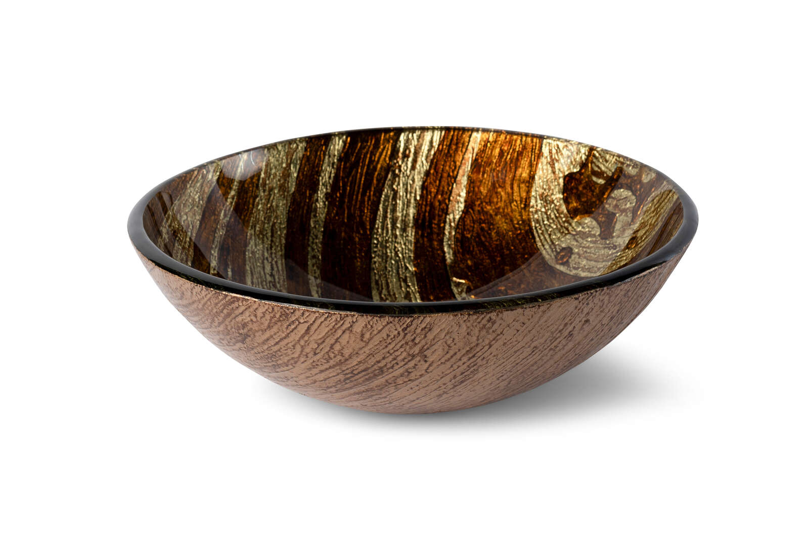 Deze waskom is gemaakt van gehard glas in een wood – hout kleur. De ronde kom heeft een metallic glanzende afwerking, dat zorgt voor een unieke uitstraling. De kom heeft een hoogte van 14,5 cm en heeft een diameter van 42 cm. De kom wordt geleverd zonder wastafelhouder en klikwaste.